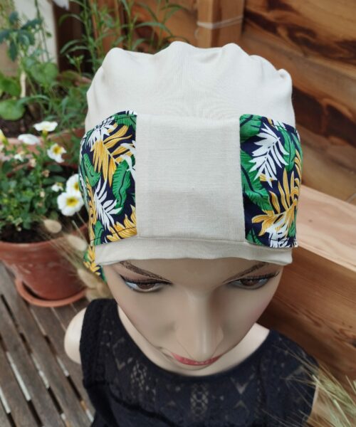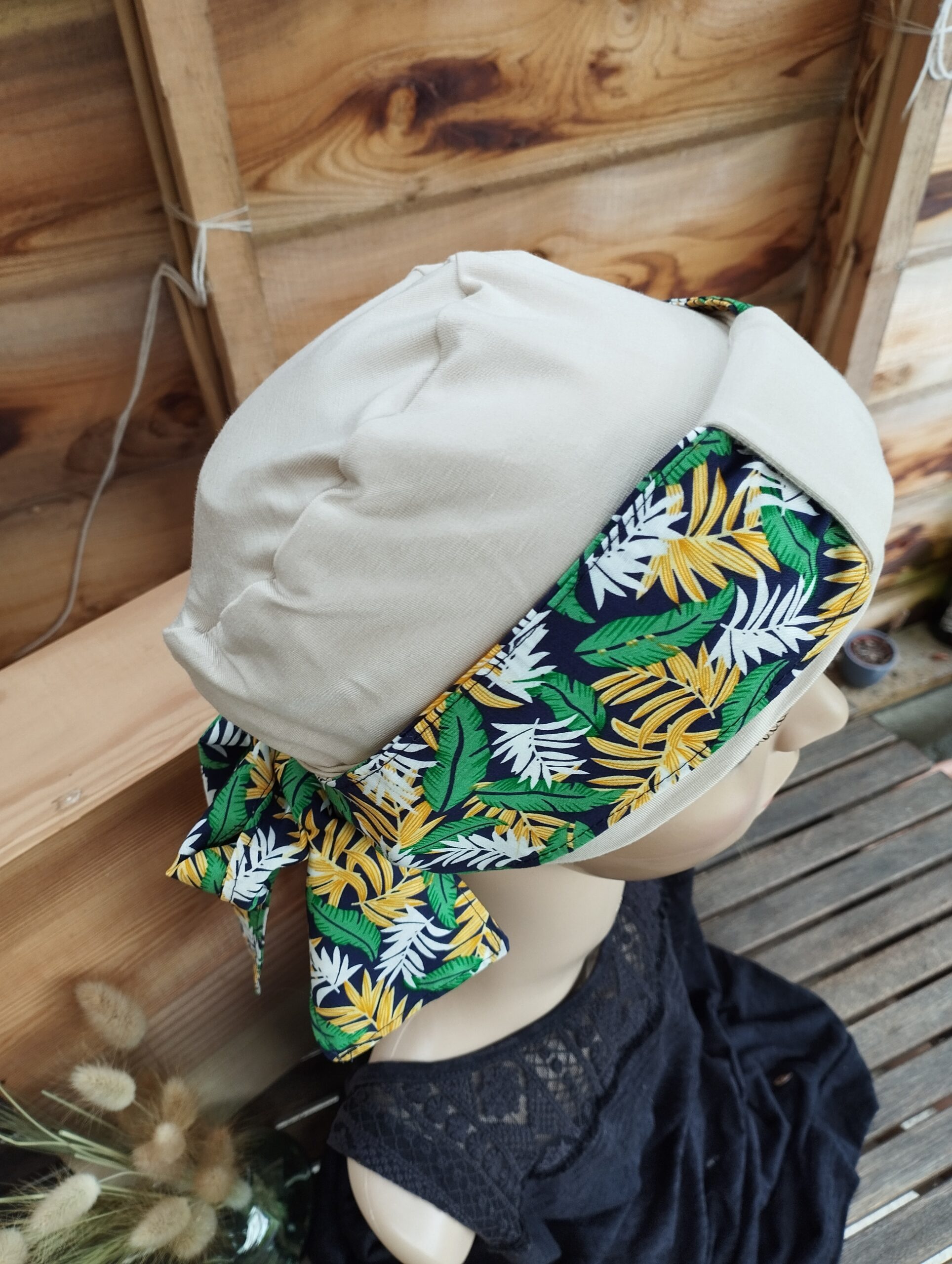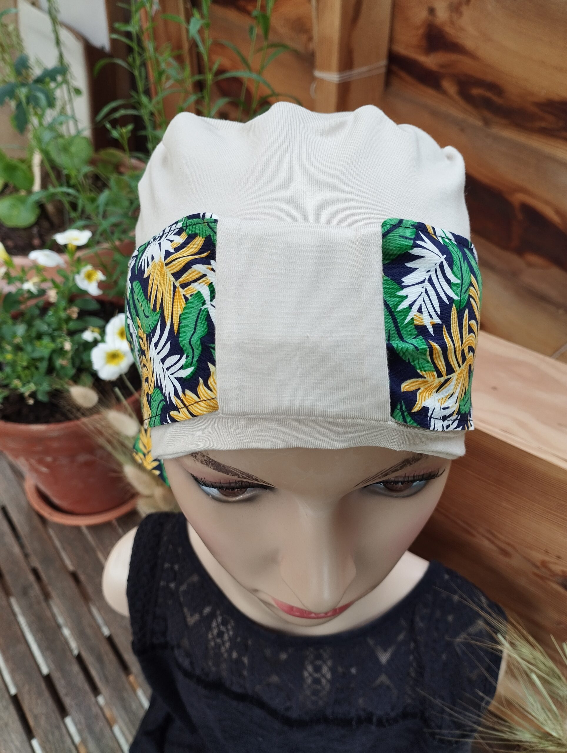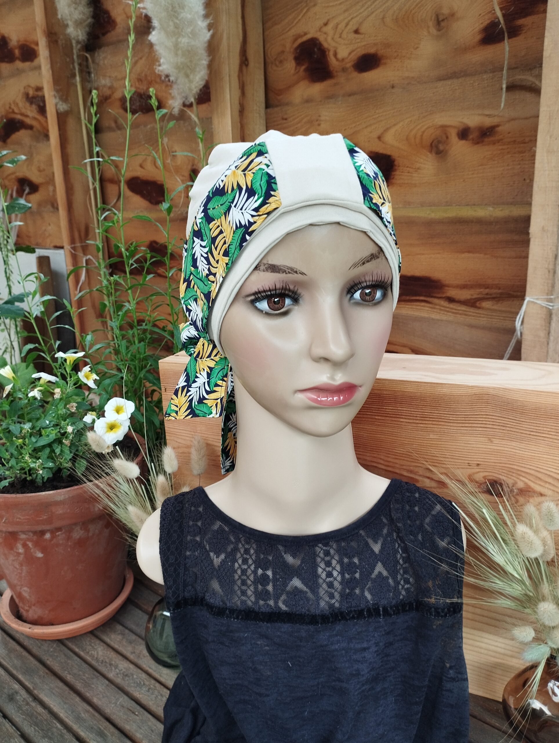 Le modèle Sylvie est un bonnet accompagné de son bandeau maintenu par un passant.