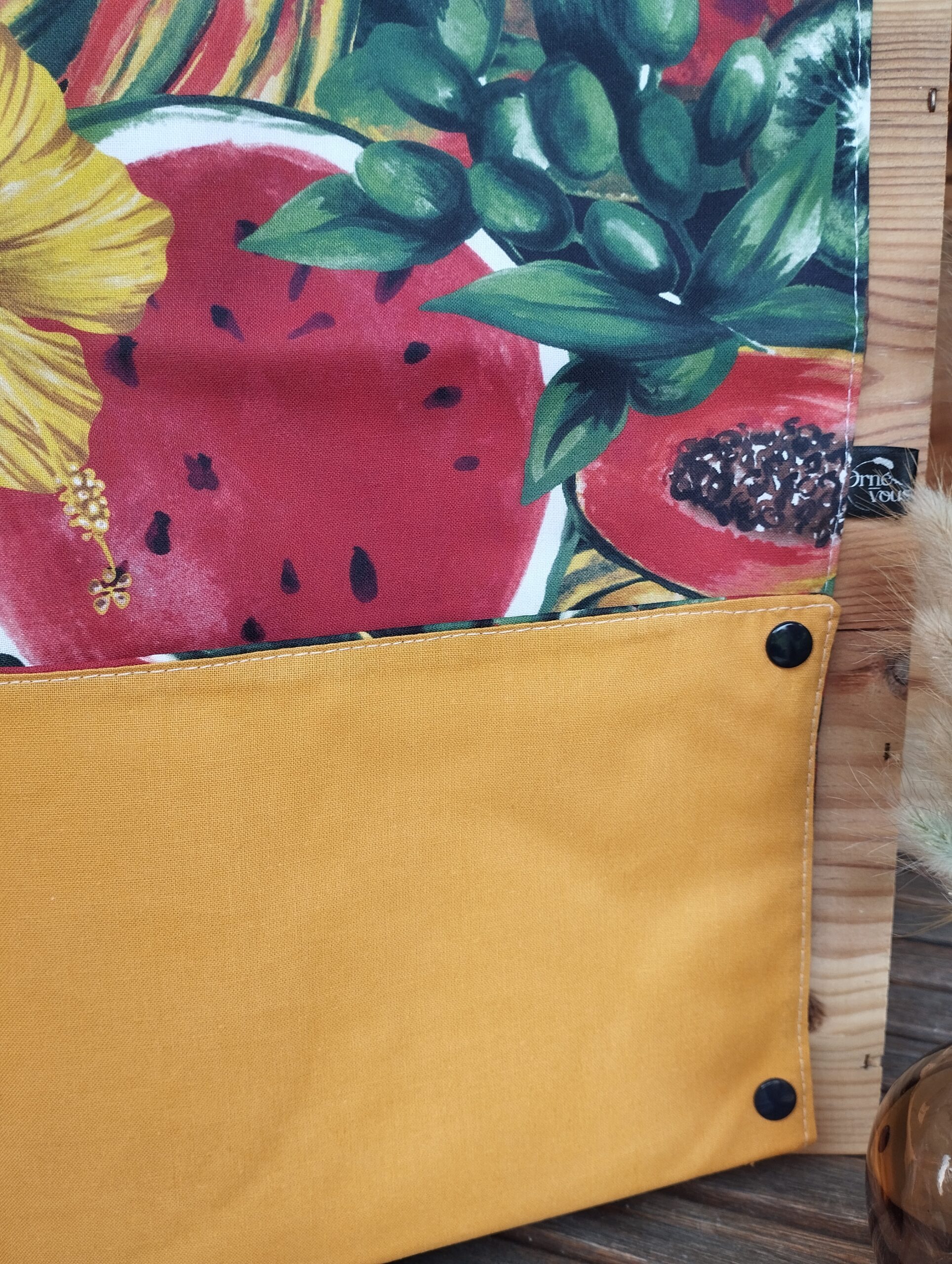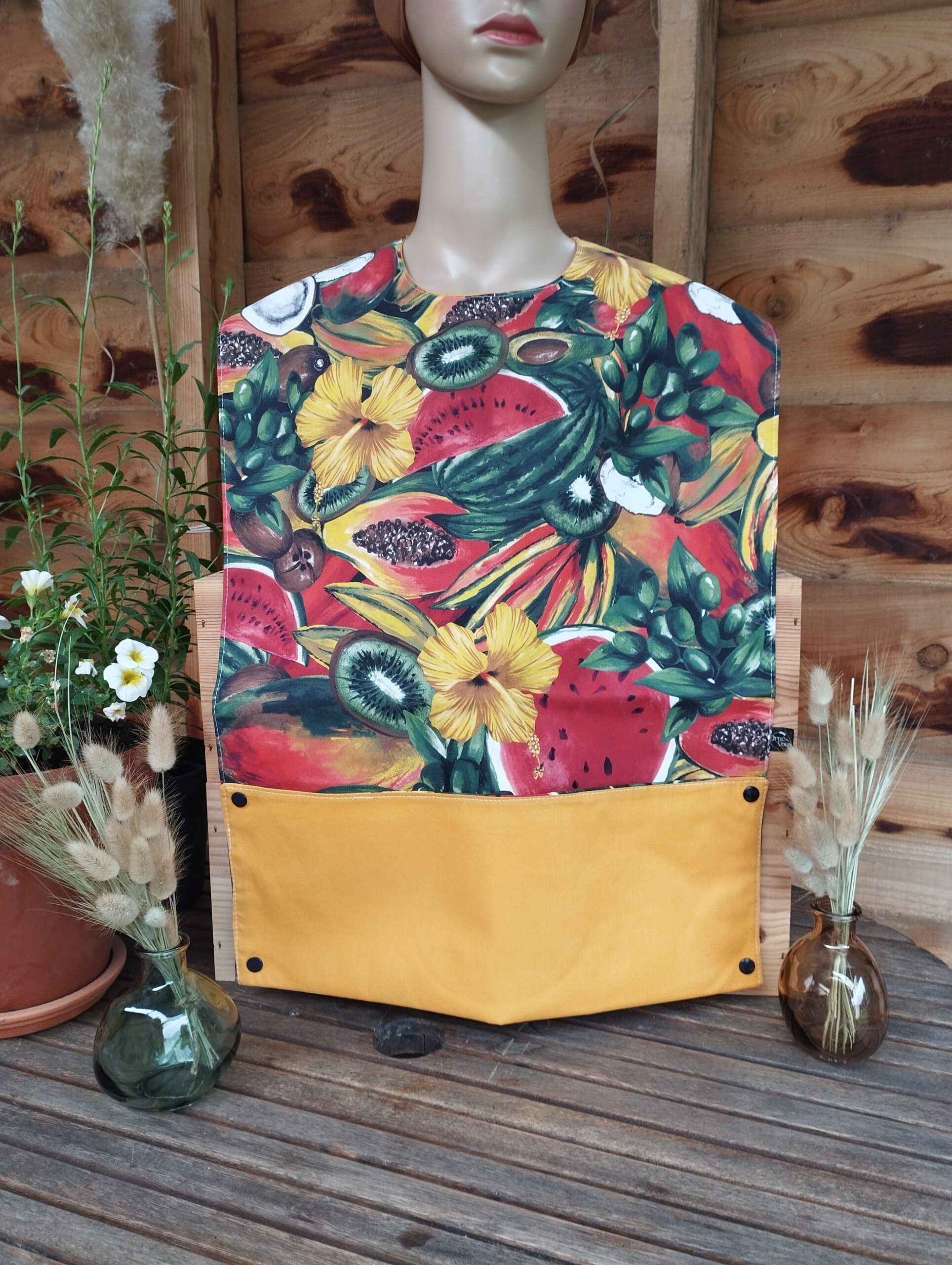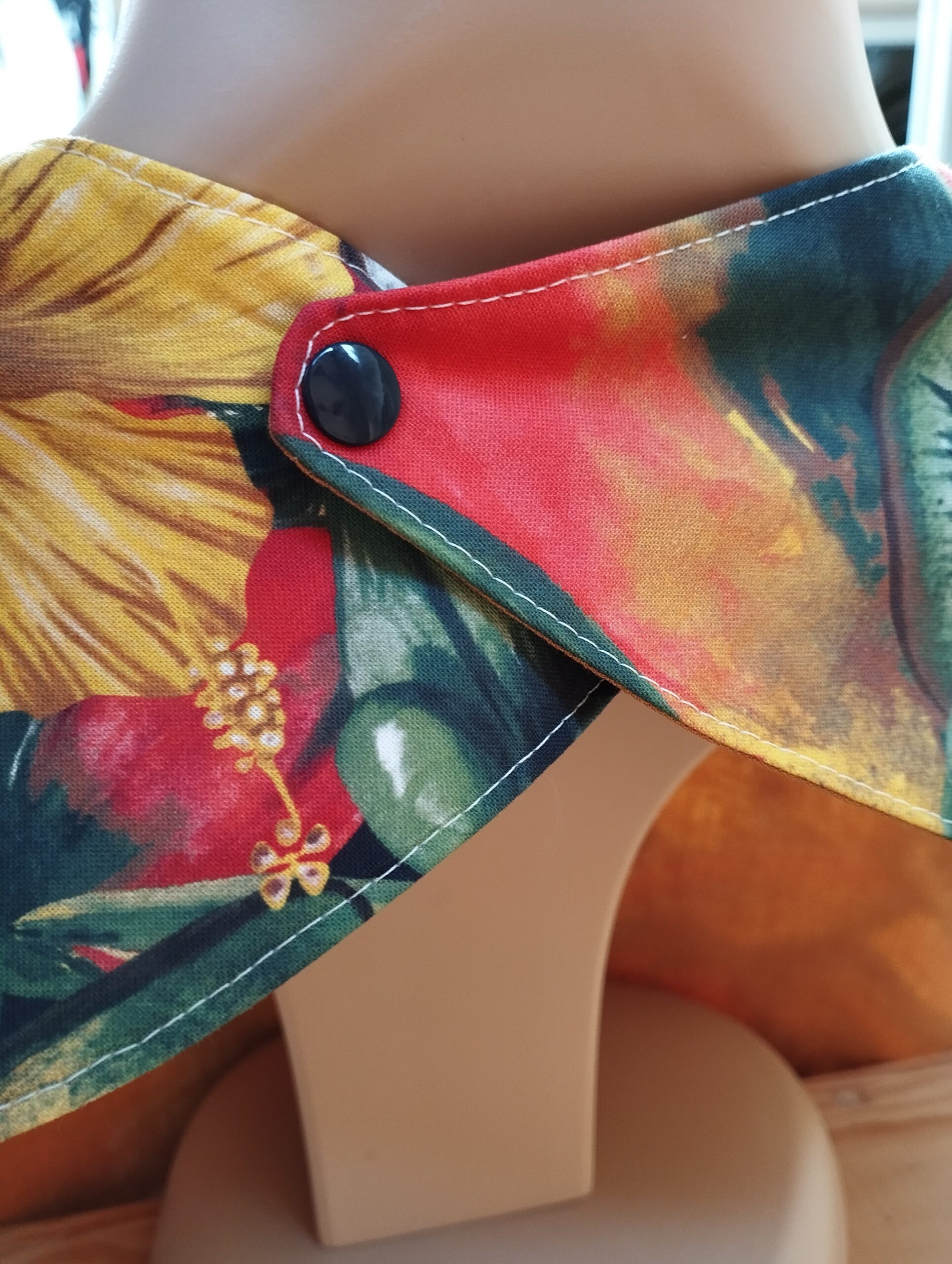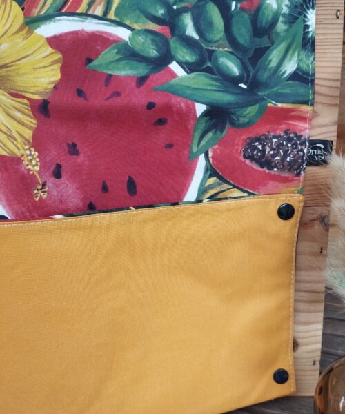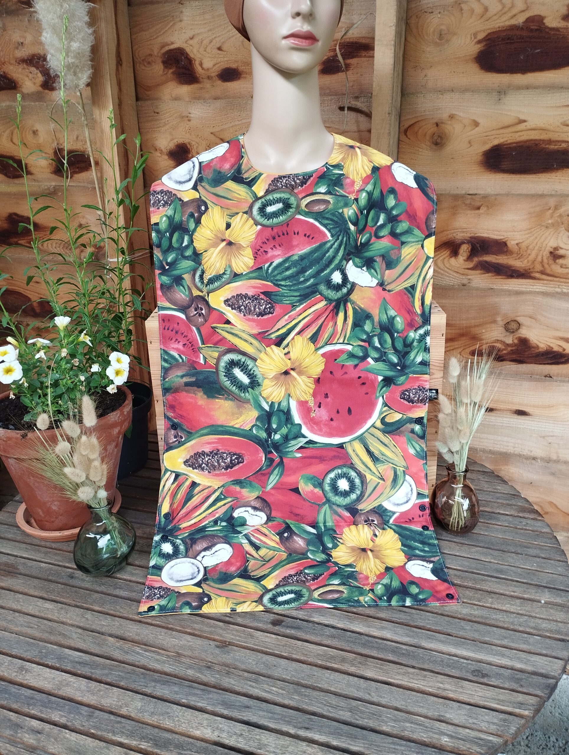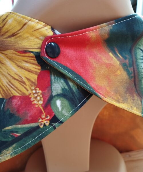 La serviette se ferme à l’aide de boutons pressions. Il est aussi possible de mettre une fermeture avec un élastique pour faciliter l’autonomie (sur commande).